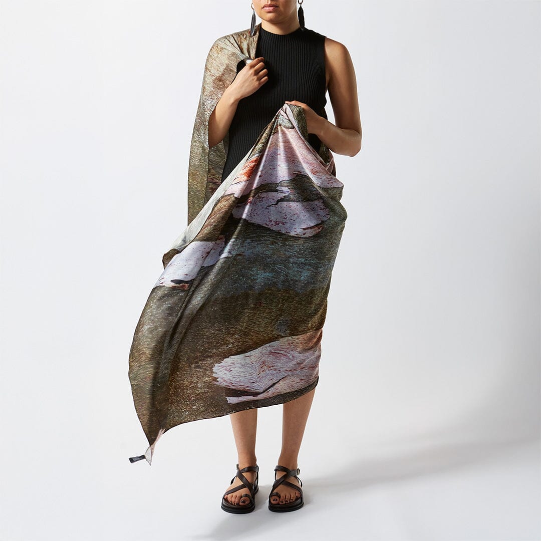 Inspired by Australia's majestic gum trees, this stunning silk scarf captures the natural artistry shaped by rain, wind, and time. Each print tells a quiet story of Country - the marks and textures revealed by weather and light.