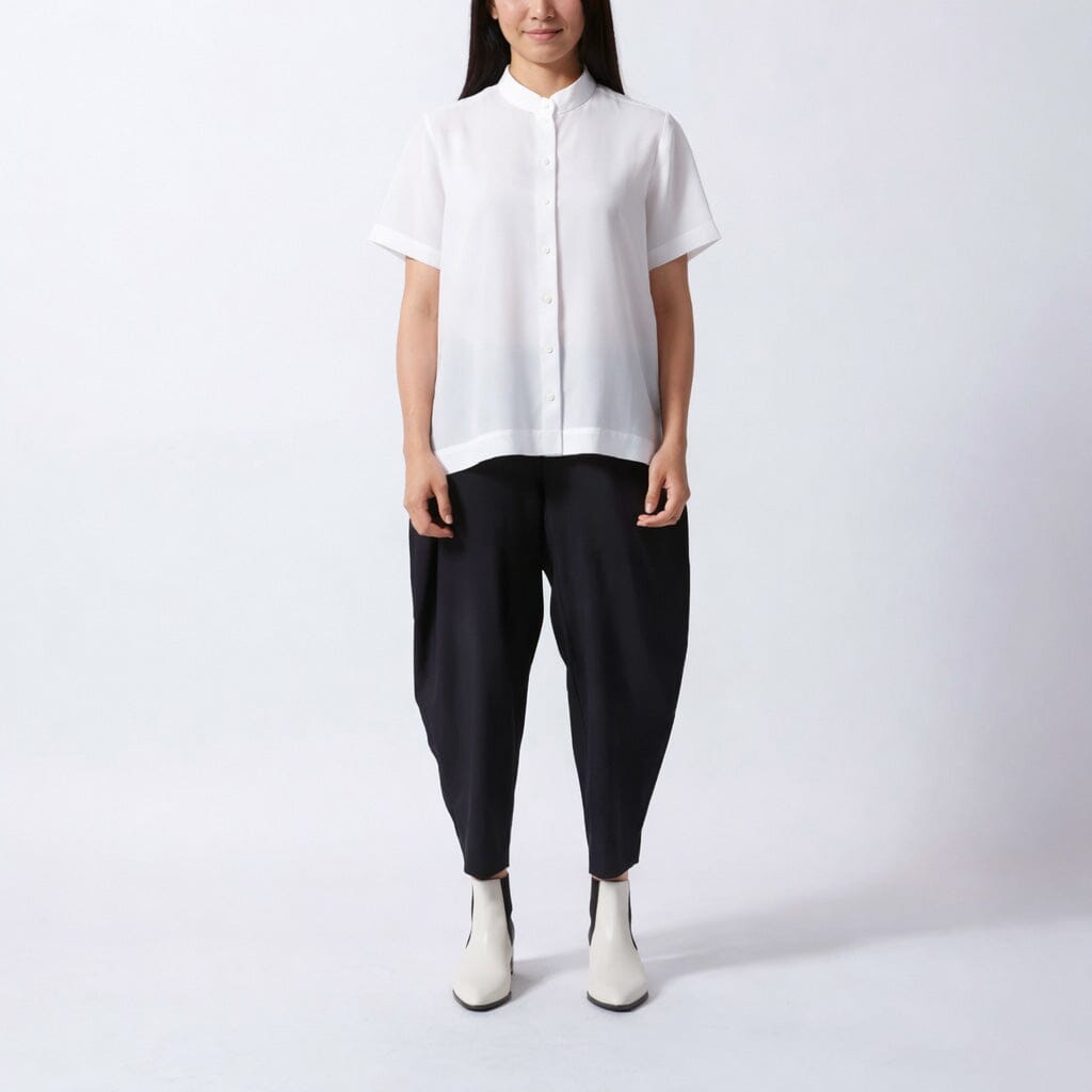 The White Silk Short Sleeve Shirt is designed with a relaxed silhouette and a refined, modern feel. Featuring a clean mandarin collar and button-through front, it offers a minimalist balance of structure and ease.