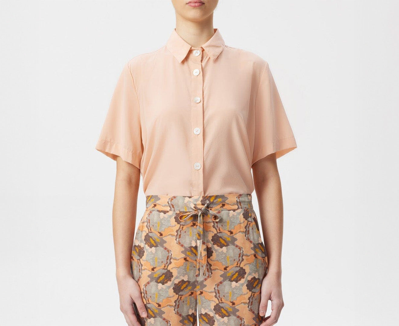 The Dusky Pink Silk Short Sleeve Shirt is designed with a relaxed silhouette and a soft, refined feel. Featuring a classic collar, button-through front and clean lines, it offers an effortless balance of structure and ease.