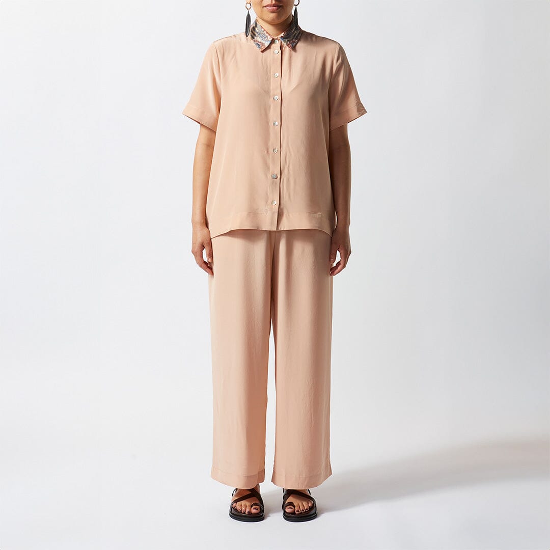 Crafted from smooth, lightweight silk, this short sleeve features a structured collar with embroidery detail, adding a subtle point of distinction. The button-through front creates a clean, classic line, while the relaxed silhouette allows the fabric to move naturally with the body.